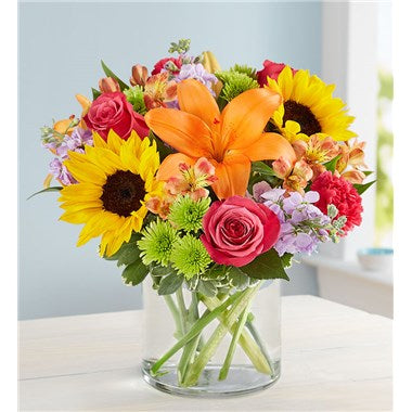 Like a warm embrace, our vibrant bouquet delivers your sentiments to someone special. A rich gathering of yellow and orange blooms, with pops of bright pink and purple, it's more than a gift - it's a way to express how you feel inside.
